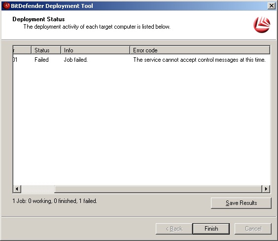 Starting with the 3.1.8 version of the BitDefender Management Server you might receive the "The service cannot accept control messages at this time" error message at the end of a deployment process as can be seen in the screenshot below.