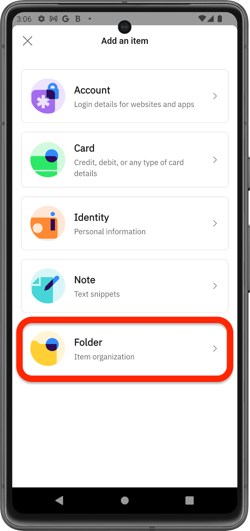 You can save new items directly to a specific folder, so there’s no need to add them first to the vault and move them later. For example, if you’ve created a folder for bank cards, you can add a new card straight to that folder.