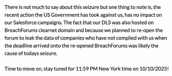However, the group's statement went on to claim that the seizure would not impact its threat to leak one billion records belonging to Salesforce customers, scheduled for 23:59 EST tonight, 10 October 2025.