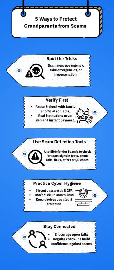 • If they receive a suspicious call or message that especially involves sending money in any form or downloading unfamiliar software, advise them to pause and verify. For instance, call the family member or institution using known, official contact info.