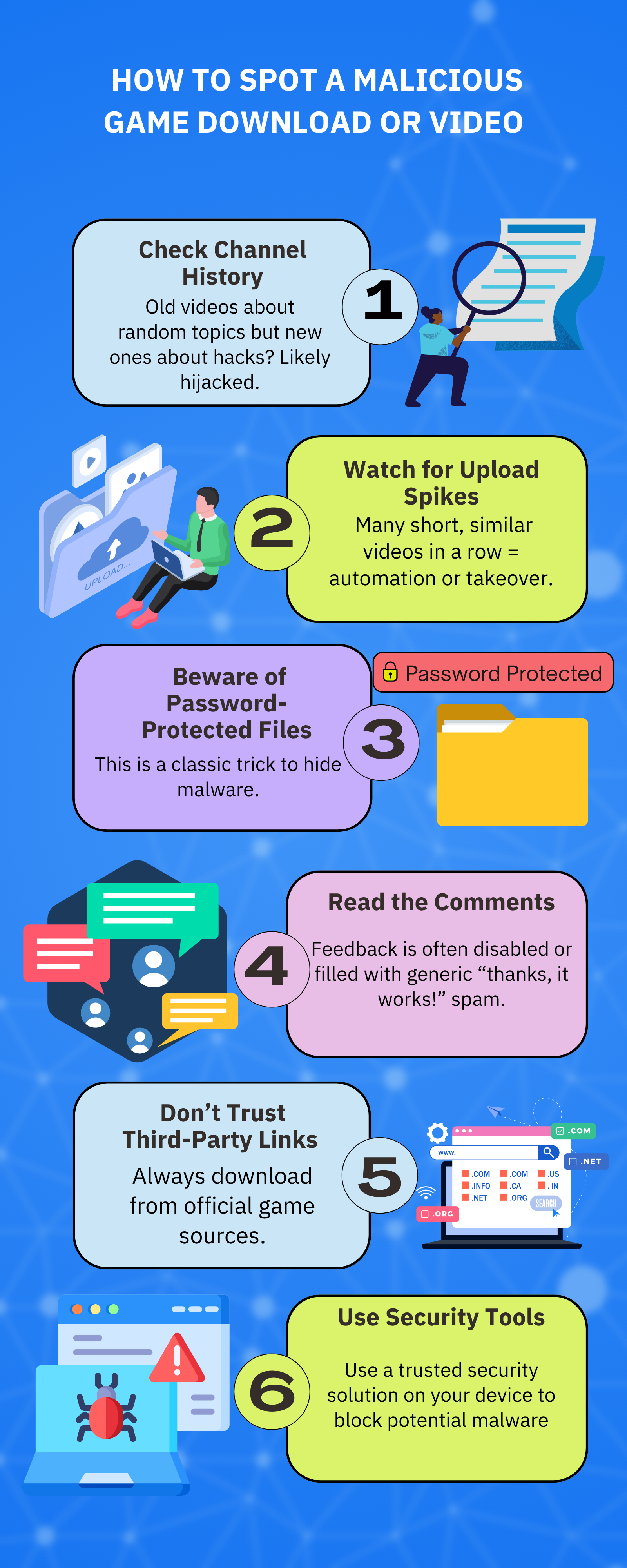 •  Download only from official sources. Stick to Steam, Epic Games Store, or official developer websites.