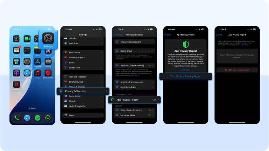 iPhone Privacy & Security settings showing App Privacy Report activation to review which apps accessed location, mic, or camera without consent
