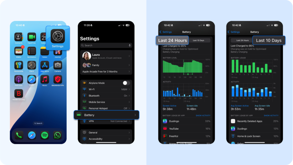 • Review Battery Usage by App for the last 24 hours and 10 days