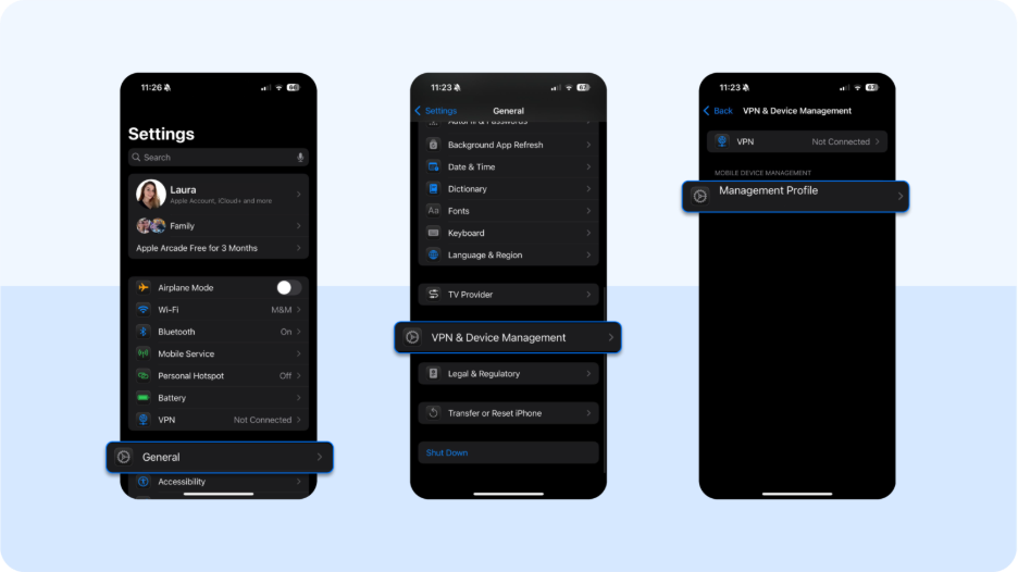 • Go to Settings → General → VPN & Device Management. If you see a profile you didn’t install as part of school, work, or a known app, delete it. Removing a profile also removes the apps and certificates it installed