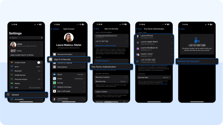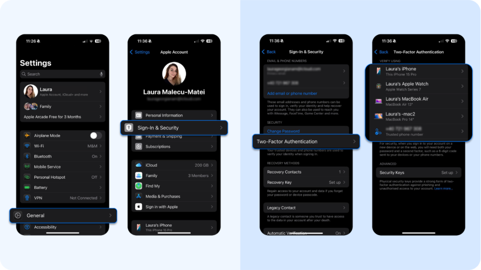 • Audit your devices regularly. Settings → [Your Name] → Devices. Remove any device you don’t recognize ASAP.