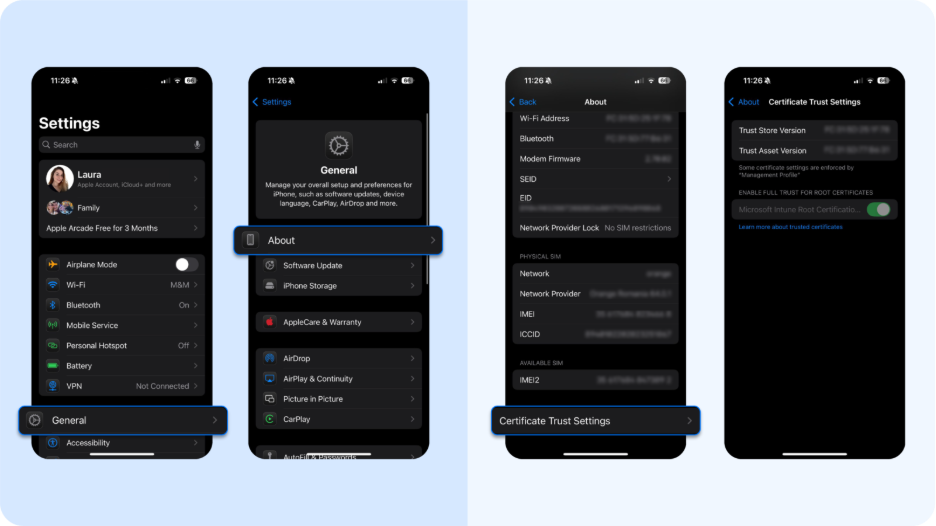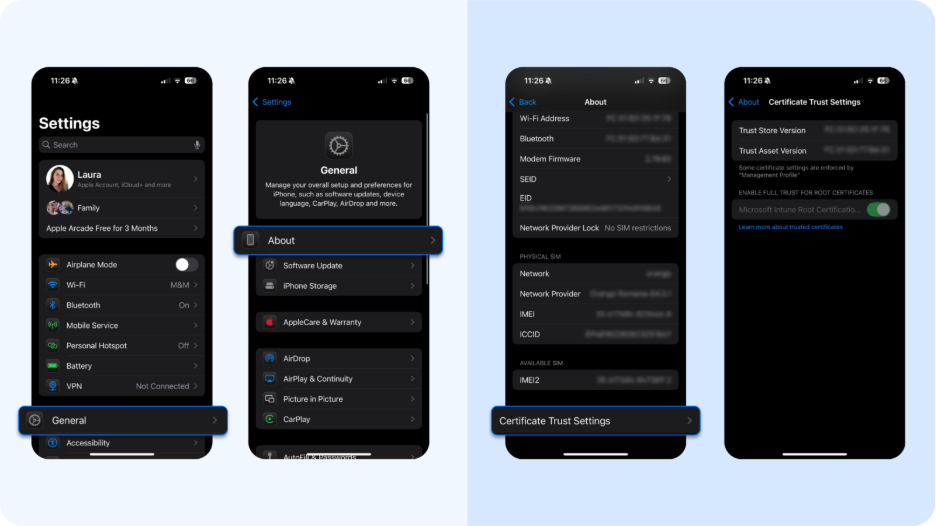 • As an extra precaution, review Settings → General → About → Certificate Trust Settings to make sure no rogue root certificates have been used.