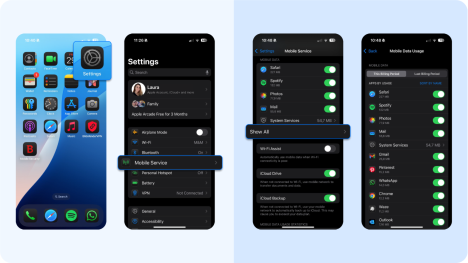 iPhone Mobile Service settings displaying data usage per app to identify unusual data spikes that may signal hacking activity
