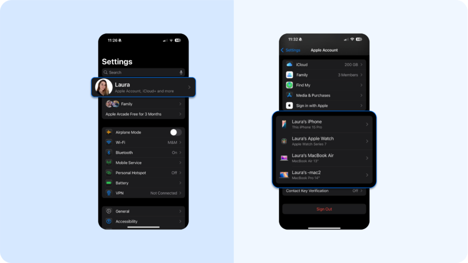 • Open Settings → [Your Name] → You'll see devices used. Carefully review every iPhone, iPad, or Mac associated with your Apple ID and remove any device you do not recognize.