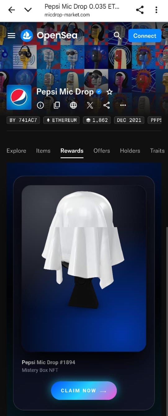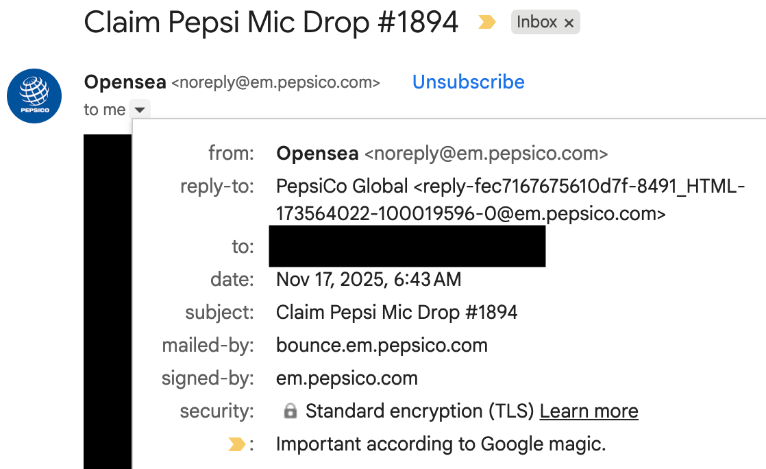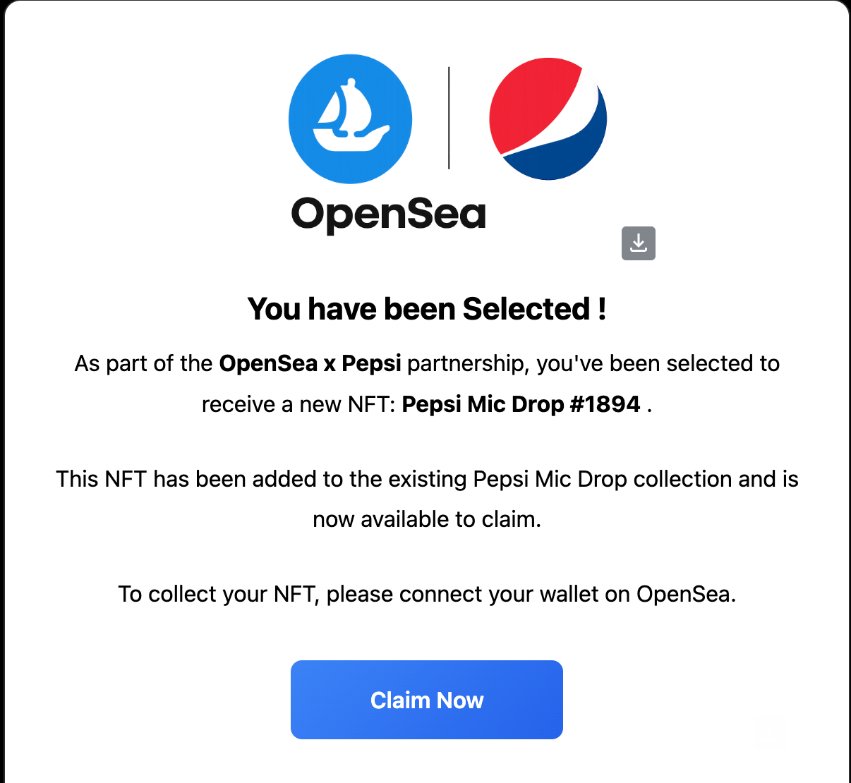 “Claim Pepsi Mic Drop #1894,” the subject line read, a formula well-known to crypto and NFT enthusiasts. “OpenSea x Pepsi partnership,” flashed the email’s body; a collaboration plausible enough to at least pique curiosity.
