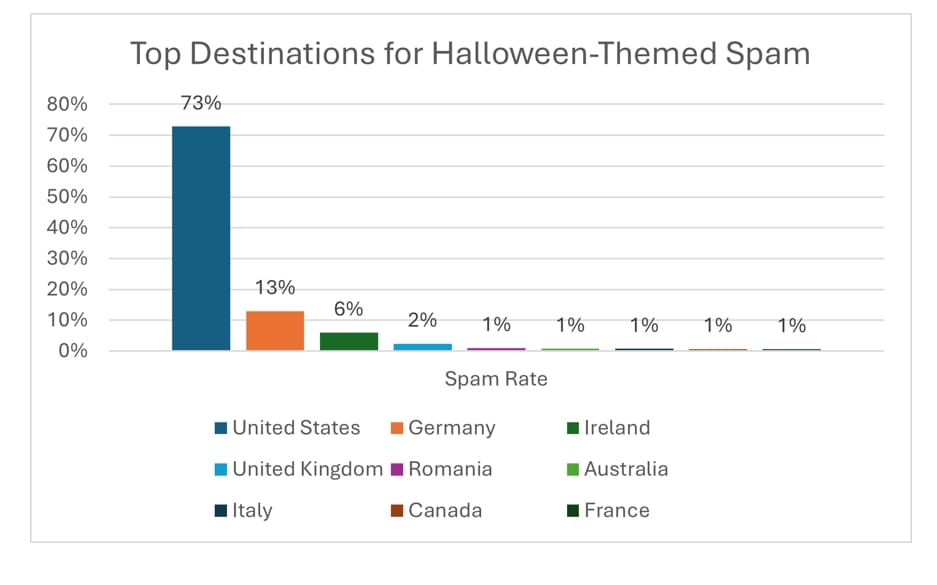 Our data shows that the United States received 73% of all Halloween-themed spam, followed by Germany (13%) and Ireland (6%). Smaller volumes reached the UK, Romania, Australia, Italy, Canada, and France.