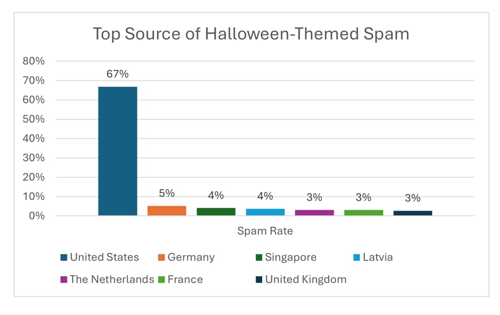 On the sending side, 67% of all Halloween spam originated from servers in the United States with Germany, Singapore, Latvia, and the Netherlands trailing behind.
