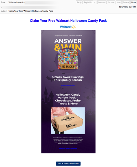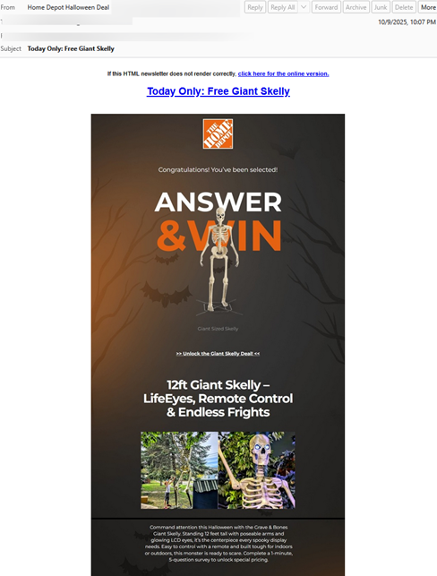 Bitdefender Antispam Lab flagged emails designed to mimic brands like Walmart, Amazon, and Home Depot, promising free candy boxes, skeleton decorations, or costumes.