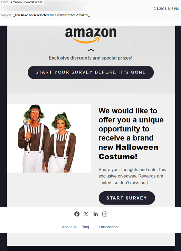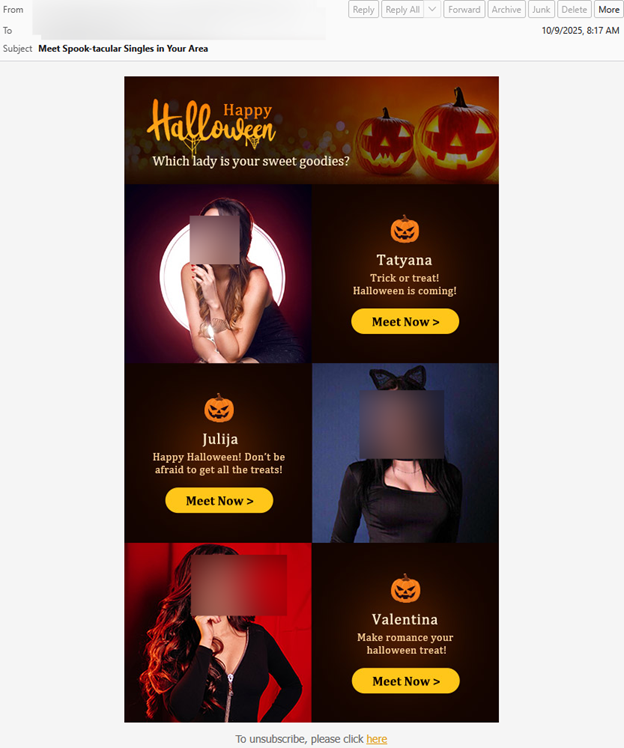 In this year’s campaigns, scammers didn’t stick to one formula. They mixed fake retail sales, cryptocurrency bonuses, brand giveaways, and even dating lures — all wrapped in Halloween imagery designed to catch attention.
