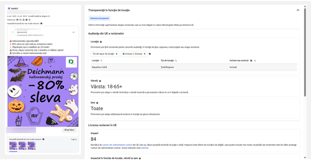 Meta transparency data revealed the campaign targeted European users (Bulgaria, Croatia, Romania, Slovakia, Slovenia) aged 18–65+, confirming its regional precision and broad age targeting.