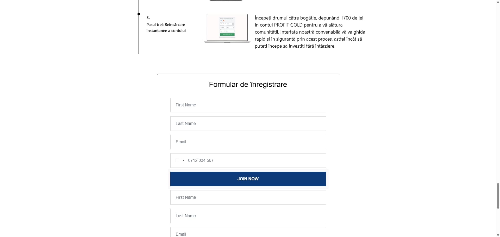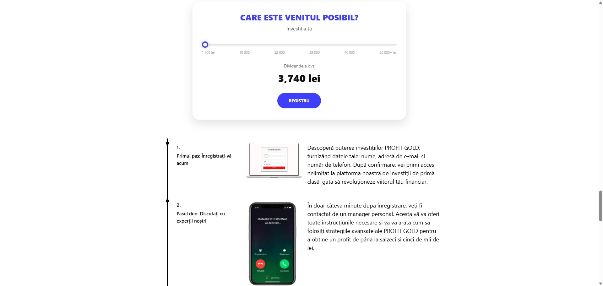 Users who click on the ads are redirected to romania-investition[.]info, which presents the fake investment app under the name Profit Gold Românesc.