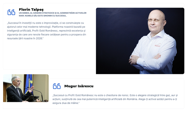 The site displays staged quotes attributed to Florin Talpeș and Mugur Isărescu, portraying them as supporters of the AI-based investment system. The messaging claims that the platform is integrated into Romania’s national development strategy and backed by advanced artificial intelligence certified in the European Union.