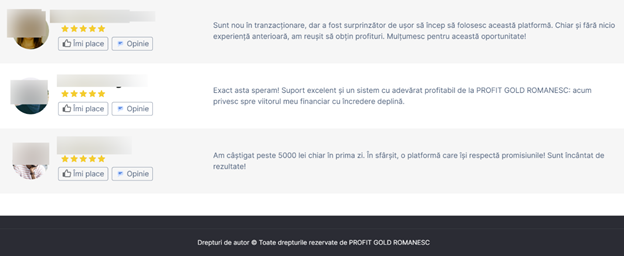 The website includes multiple five-star reviews from individuals presented as satisfied investors. Testimonials claim profits of 5,000 lei on the first day and praise the platform’s support team and reliability.