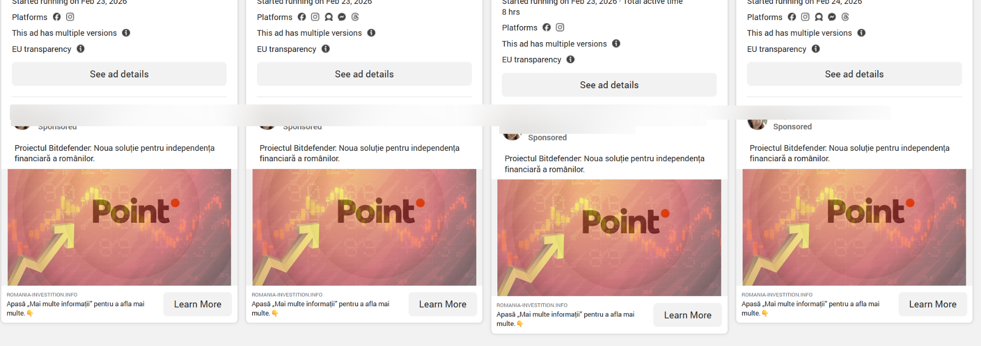 • Around 130 fraudulent Meta ads were launched from a single page starting February 22, 2026, designed to persuade Romanians to deposit money into a fake AI investment scheme and surrender personal information