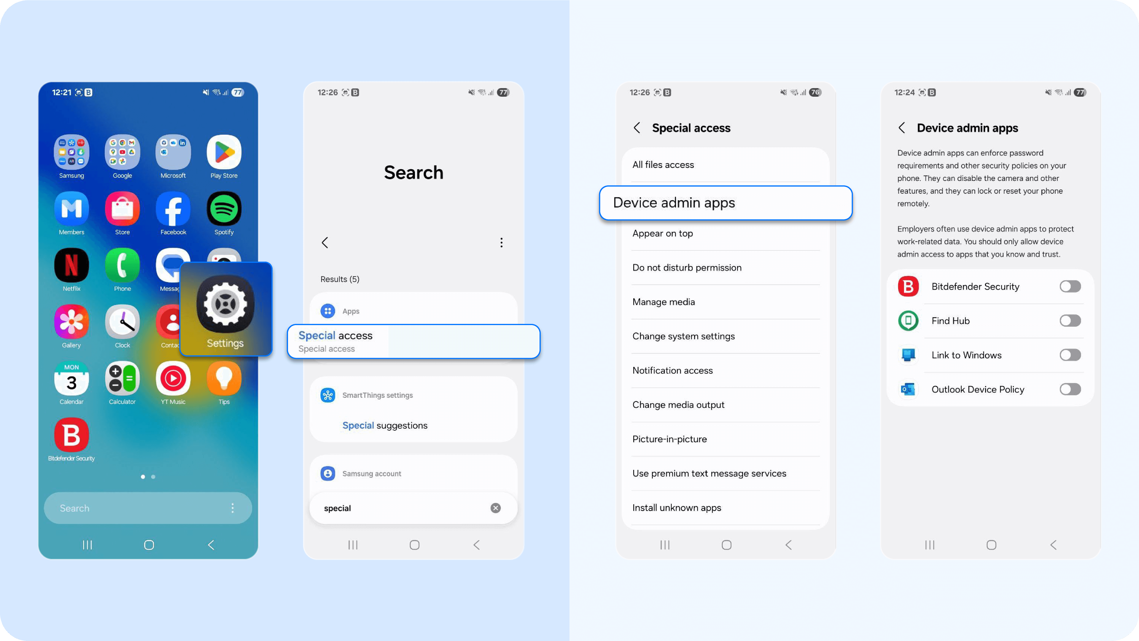 These tools can also alert you to vulnerabilities in your system, such as outdated device security patches or unsafe settings, to prevent future infections. You can use a reliable antivirus app, such as Bitdefender, to perform a thorough scan, detect malware, and ensure your device is clean.