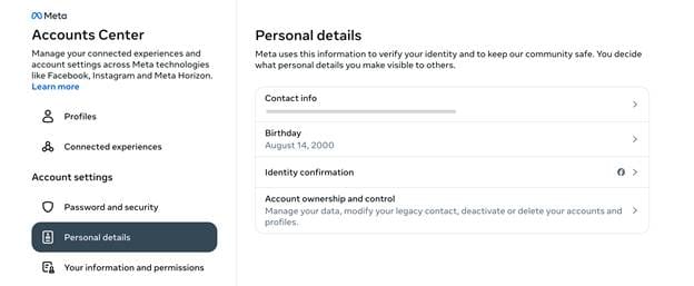 ● If you still have access, go to your Profile → Menu → Accounts Center → Personal Details.