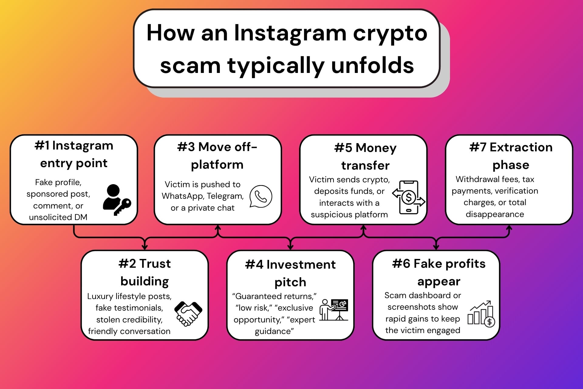 Instagram scams exist within a larger ecosystem of impersonation, phishing, financial fraud and account takeover. But Instagram crypto and investment scams deserve a spotlight because they can inflict some of the most devastating losses through: