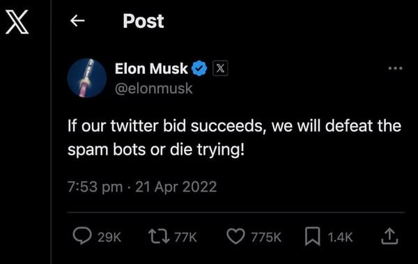 Ironically, one of Musk's stated aims before acquiring Twitter for US $44 billion was to purge bots from the site, saying "we will defeat the spam bots or die trying."