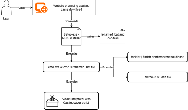1. Initial Access: The user downloads the lure "game installer" archive and either double clicks the setup.exe inside or extracts the files in the intended location and then runs the setup.