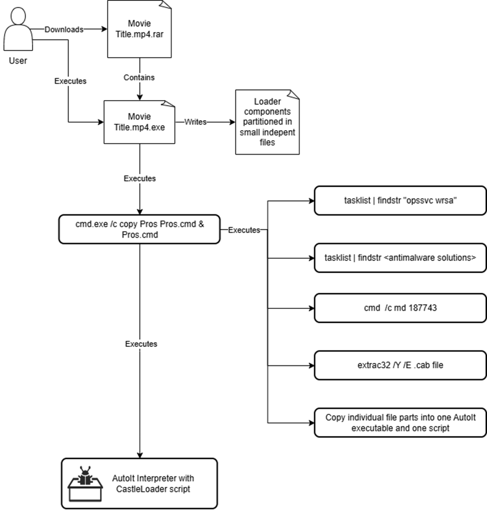 CastleLoader is a script-based loader that aims to decrypt and load a payload into memory. Variants are implemented in Python, but we discovered one implemented in AutoIt in this campaign.