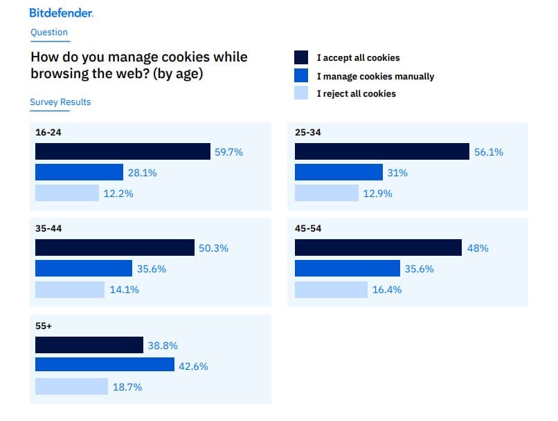 Las generaciones más jóvenes son las que más probabilidades tienen de aceptar a ciegas, mientras que los grupos de mayor edad al menos intentan gestionar la configuración.