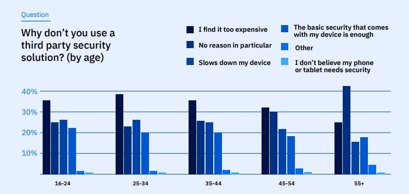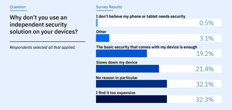 La razón más citada para evitar las apps de seguridad móvil es el costo. Aproximadamente el 32,3% de los encuestados dijo que el software de seguridad es demasiado caro.