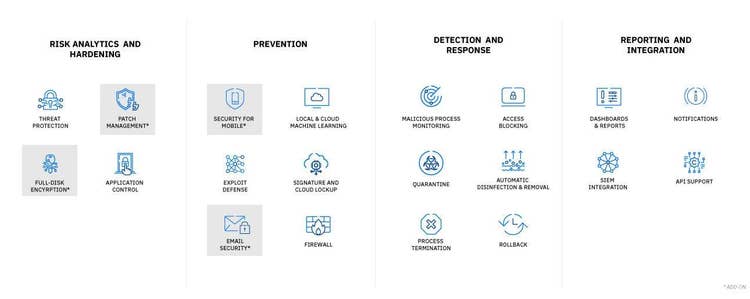 An adaptive-layered architecture that includes endpoint controls, prevention, detection, remediation and visibility.