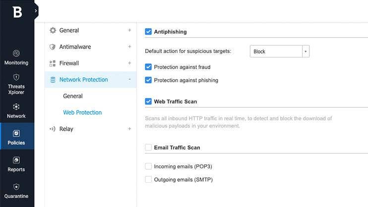 Scans incoming web traffic, including SSL, HTTP and HTTPSs traffic, to prevent the download of malware to the endpoint. Automatically blocks phishing and fraudulent web pages.