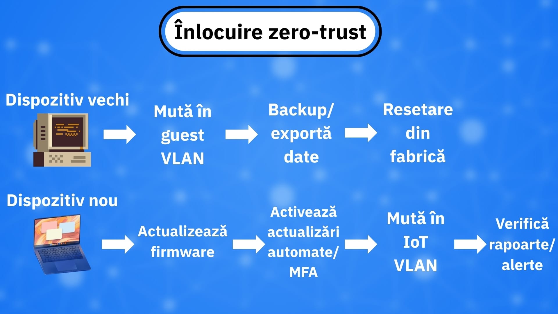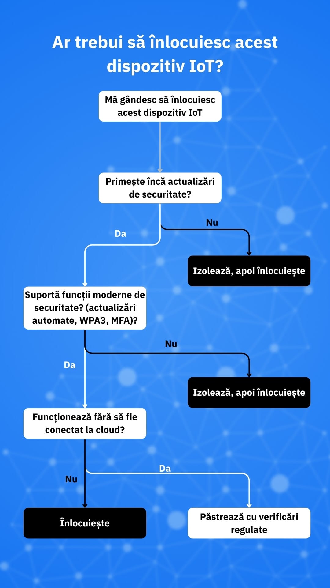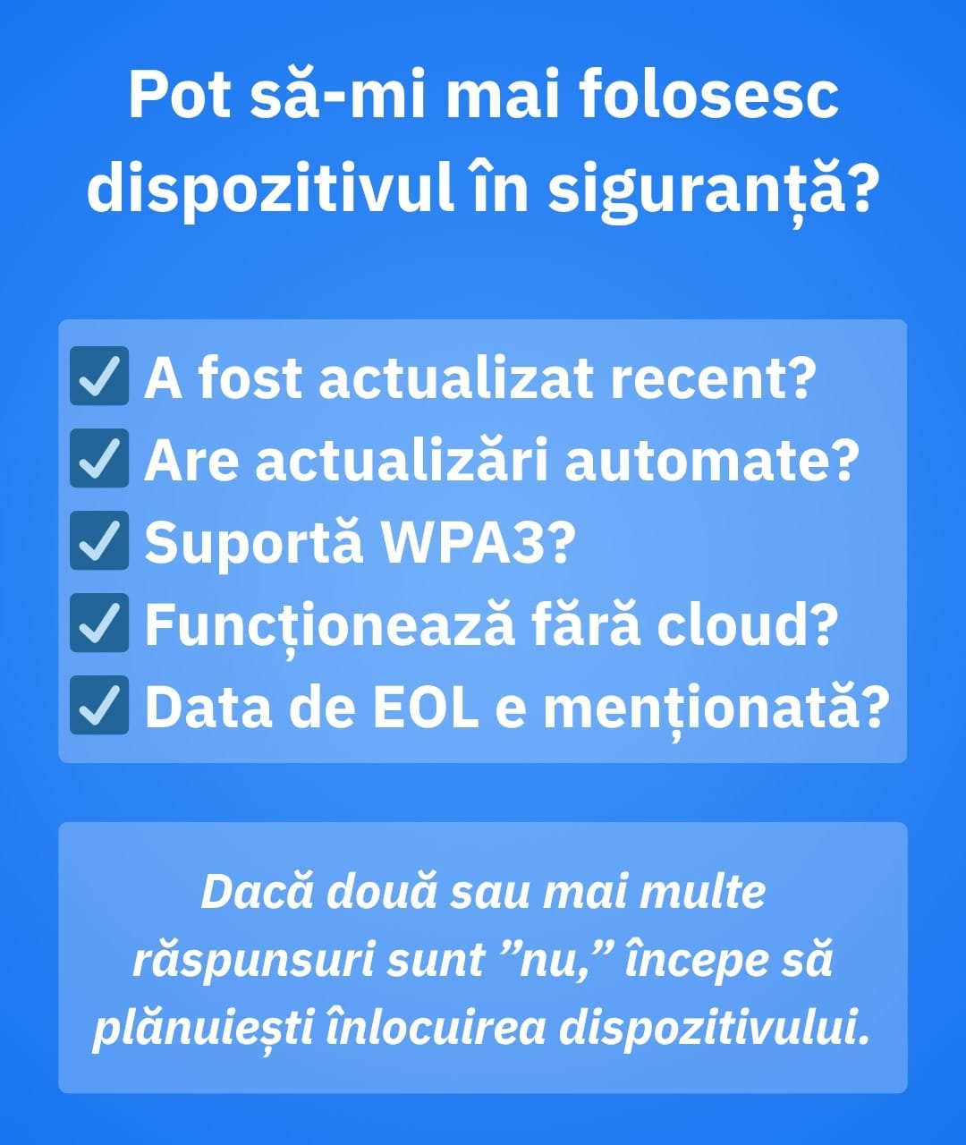Dacă un dispozitiv nu mai primește patch-uri, nu mai funcționează fără cloud sau nu respectă standardele moderne de securitate precum WPA3 și actualizările automate, este momentul să îl înlocuiești. Urmează fluxul decizional din acest articol, izolează dispozitivele vechi cât aștepți și scoate-le din uz în siguranță.