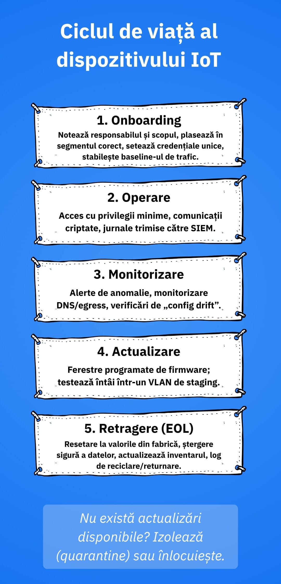Fiecare dispozitiv conectat, de la prize smart la monitoare pentru bebeluși, parcurge un ciclu de viață: achiziție, configurare, utilizare, întreținere și scoatere din uz. Riscurile de securitate evoluează pe tot parcursul acestui ciclu și aproape întotdeauna cresc în faza finală, când suportul oficial se încheie.