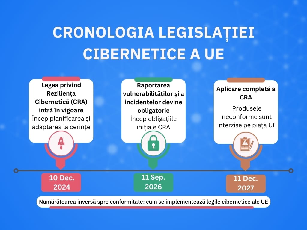 Obligațiile de raportare ale CRA intră în vigoare la 11 septembrie 2026. Începând de atunci, producătorii trebuie să raporteze vulnerabilitățile exploatate activ și incidentele grave care afectează securitatea produselor cu elemente digitale.