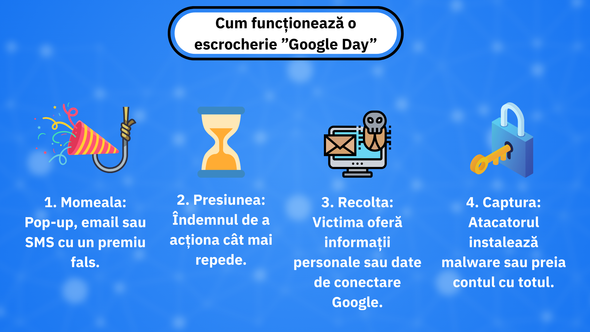 „Google Day” este o poveste inventată de scammeri pentru a atrage rapid victime. Dacă primești un astfel de mesaj, respiră adânc, fă un pas înapoi și analizează.
