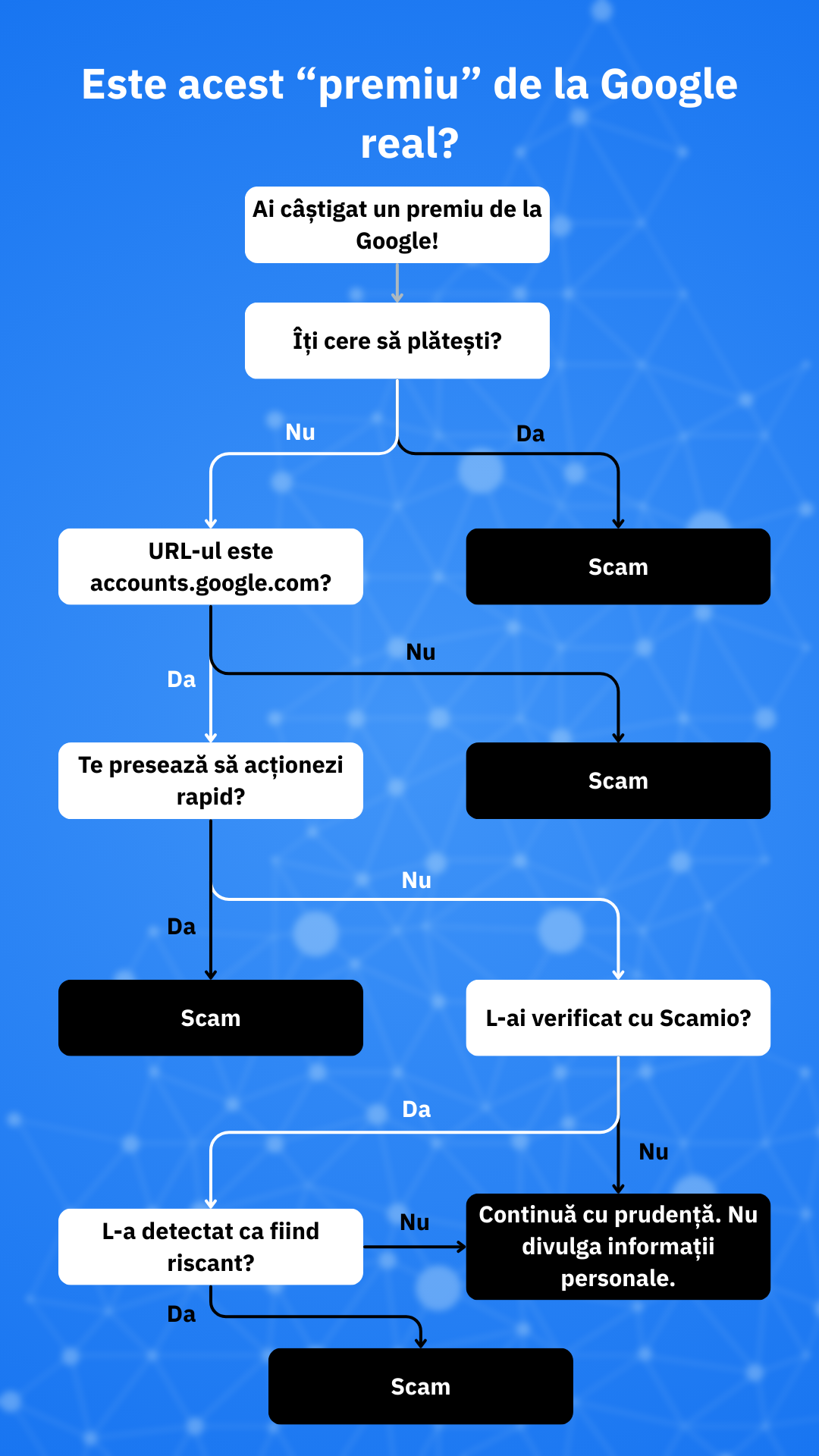 Chiar dacă scammerii își schimbă tehnicile, regula de bază rămâne aceeași: nu plătești niciodată pentru un premiu și nu te lași grăbit să acționezi „acum”.