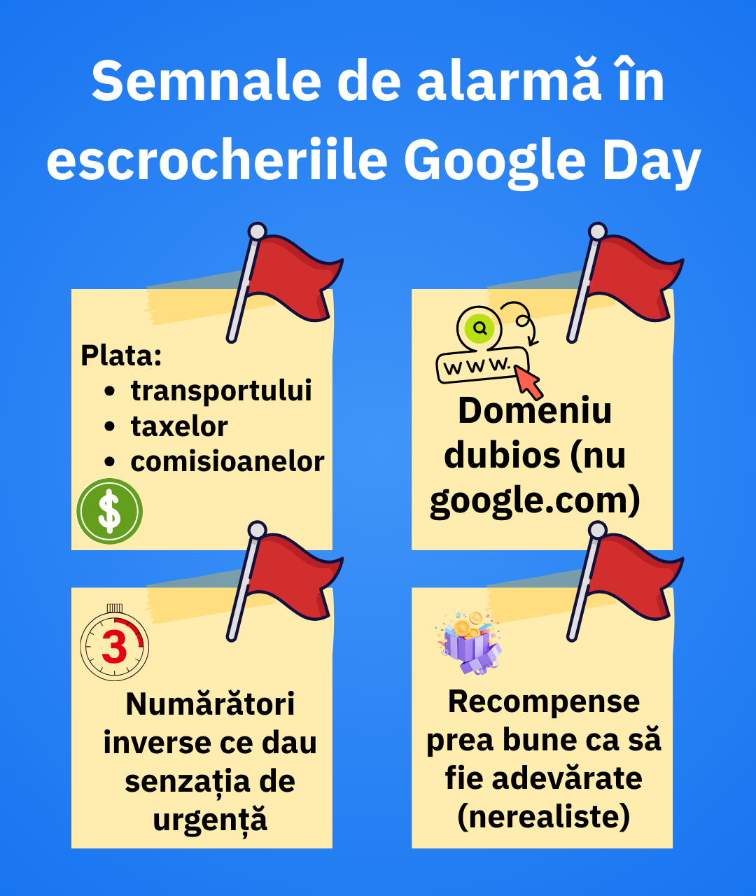 Prima linie de apărare împotriva escrocheriilor „Google Day” este vigilența. Recunoașterea tacticilor și a semnalelor de alarmă îți poate salva contul. Printre cele mai comune semnale de alarmă se numără: