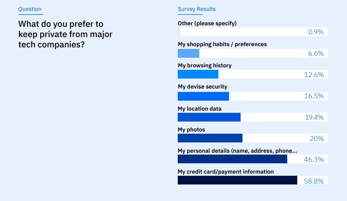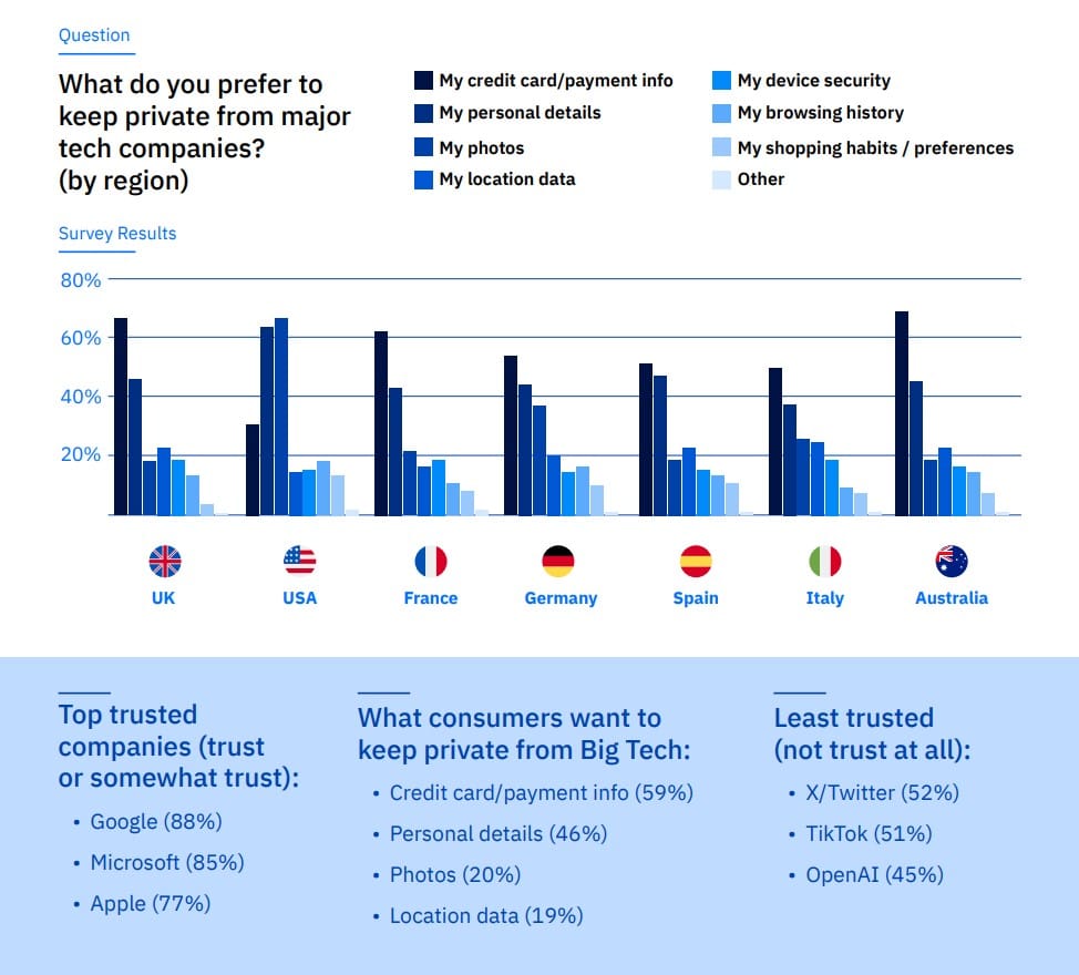 După cum arată raportul nostru, chiar și atunci când există încredere, aceasta nu se extinde la datele financiare și personale sensibile. Majoritatea consumatorilor trasează linia la partajarea informațiilor financiare, iar 59% spun că doresc să își țină datele cardurilor și ale plăților departe de marile companii tehnologice. Unul din cinci vrea, de asemenea, să își protejeze fotografiile (20%) și datele de localizare (19%).