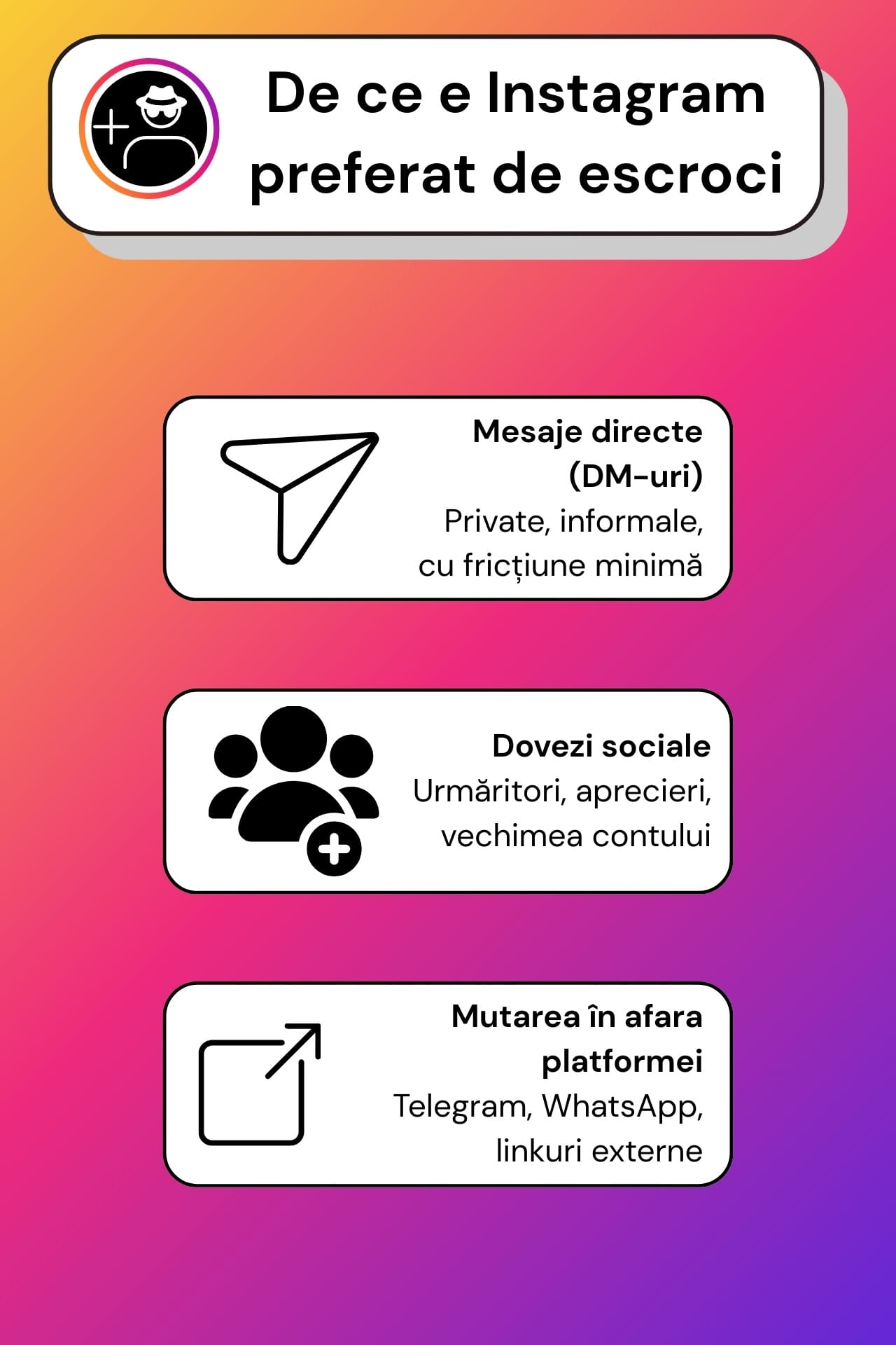 Instagram oferă trei elemente de care escrocii profită din plin: scalare facilă, încredere și negare plauzibilă. Escrocii pot crea sau deturna conturi în masă. Odată ce fac acest lucru, pot începe să atragă victime prin mesaje directe (DM-uri) care par personale, reușind adesea să le redirecționeze către alte platforme înainte ca acestea să-și dea seama că ceva nu este în regulă.