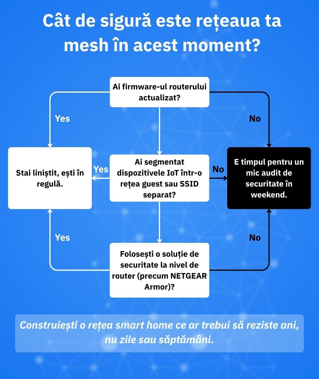 Securizează-ți routerul, segmentează-ți rețeaua IoT, alege dispozitive cu suport de actualizare și folosește o soluție precum NETGEAR Armor pentru a proteja perimetrul, în timp ce standardul Thread își continuă evoluția.
