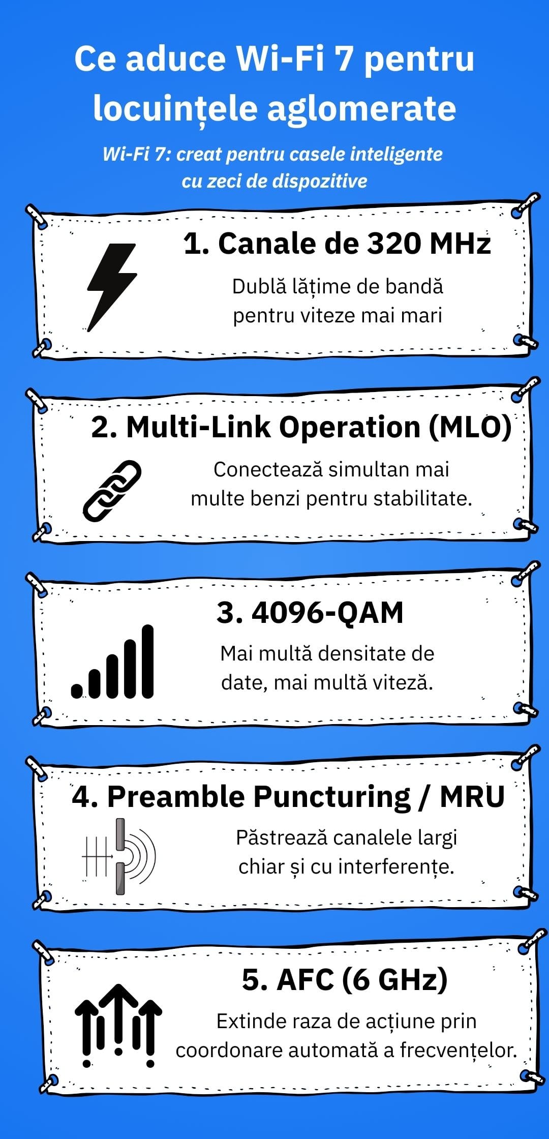 Da. Wi-Fi 7 schimbă modul în care rețeaua gestionează zeci de dispozitive simultan. Datorită MLO, canalelor de 320 MHz și modulației 4K-QAM, oferă viteze mai mari, latență mai mică și streaming mai fluent chiar și într-o casă plină de gadgeturi conectate. În locuințele dense, diferența se simte mai ales în stabilitate și timpi de răspuns.