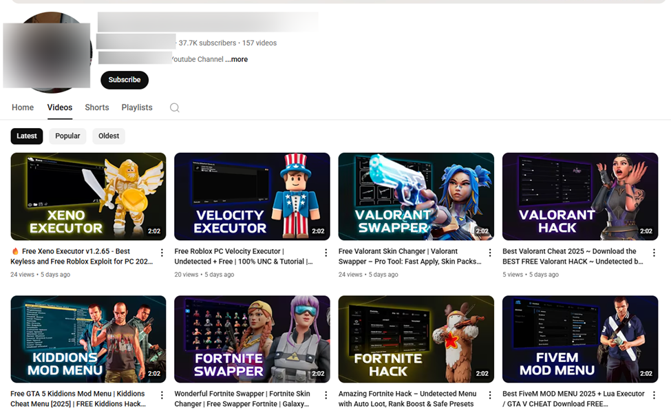 În numeroase cazuri, videoclipurile vechi — complet fără legătură cu noile postări — rămân vizibile, indicând identitatea originală a canalului. Un exemplu clar este un canal cu peste 37.000 de abonați din Indonezia, care, începând cu 1 octombrie, a început să publice videoclipuri despre „cheat-uri” și „executabile gratuite”, expunând o audiență numeroasă la fișiere malițioase mascate în unelte de gaming.