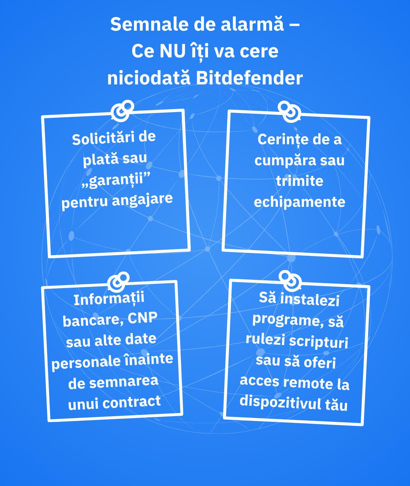 Nu trimite bani și nu instala programe terțe. Bitdefender nu îți va cere niciodată să plătești, să instalezi software sau să efectuezi tranzacții financiare în timpul procesului de recrutare.