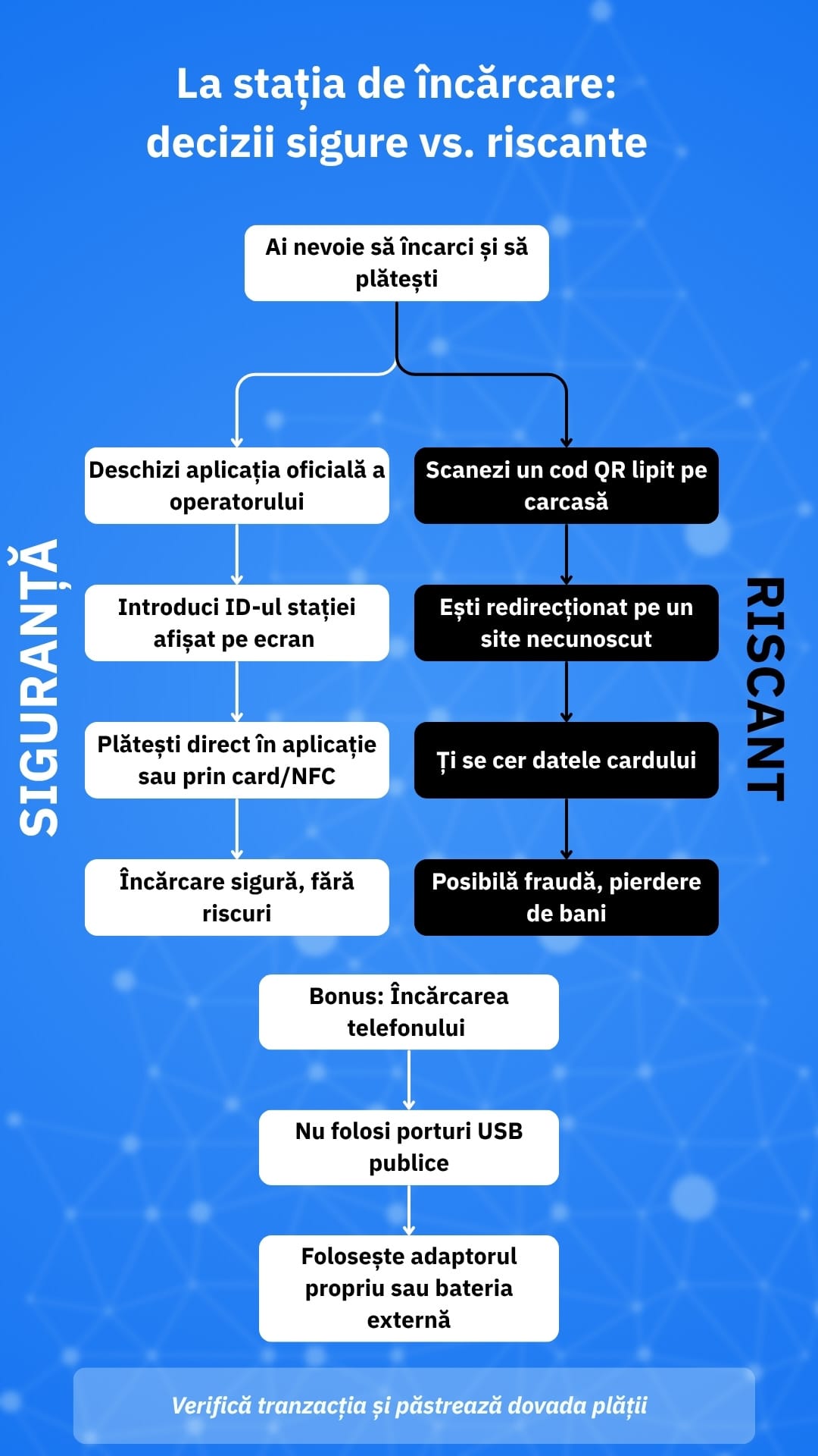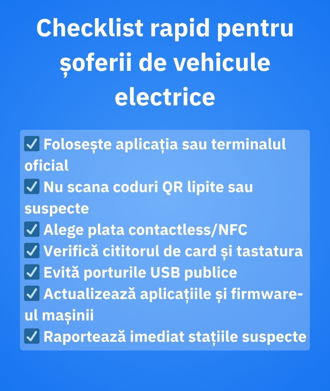 Vestea bună: câteva obiceiuri simple neutralizează majoritatea problemelor; folosește aplicația oficială sau terminalul stației, evită codurile QR lipite, plătește contactless, nu folosi USB-uri publice, ține la zi firmware-ul și aplicațiile, iar când ceva pare în neregulă, raportează imediat.