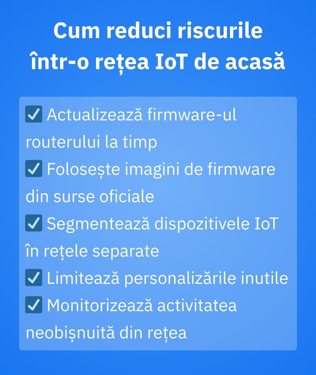 • Segmentează-ți casa inteligentă: pune dispozitivele IoT pe o rețea de oaspeți sau pe VLAN atunci când este posibil, astfel încât compromiterea unui singur dispozitiv slab să nu se propage în întregul ecosistem