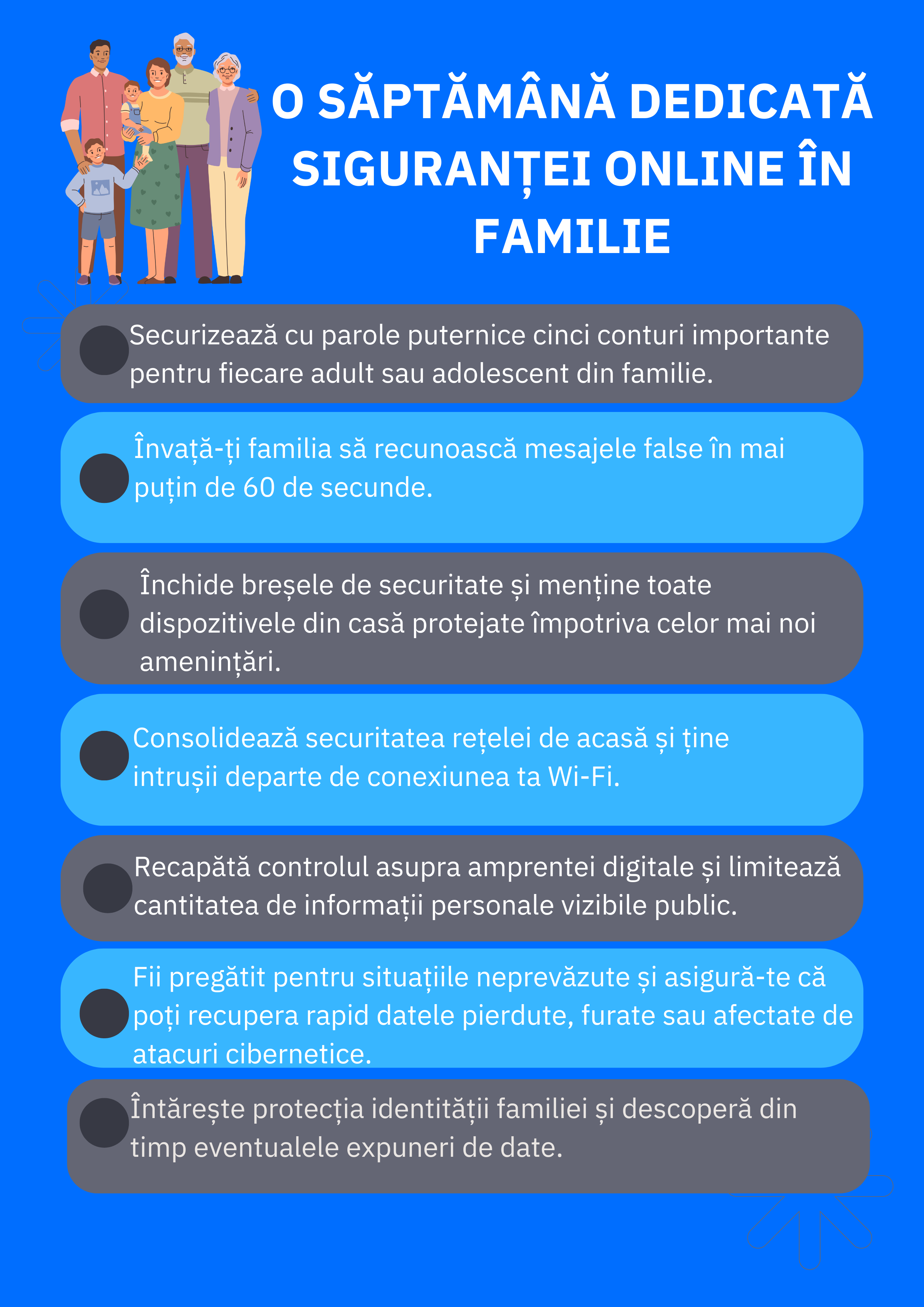 De aceea, te invităm să iei parte la Provocarea Siguranței Online – un program de șapte zile cu activități scurte și practice, concepute pentru întreaga familie. În fiecare zi vei lucra la un obicei esențial de securitate: parole mai puternice, recunoașterea înșelătoriilor, actualizări de dispozitive și protejarea vieții private.