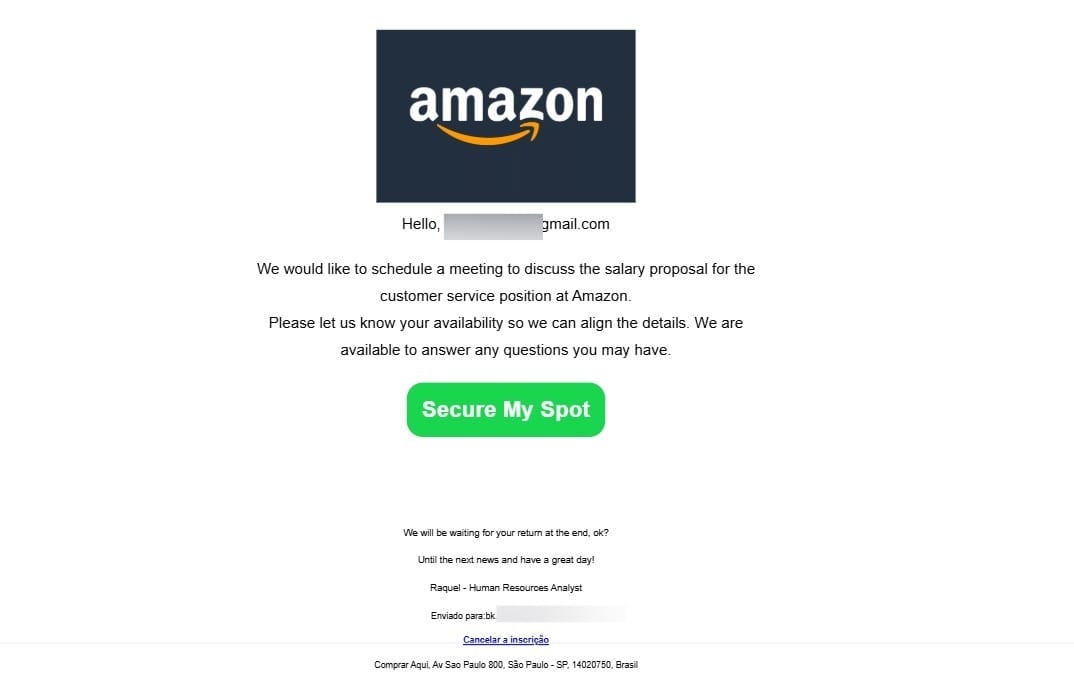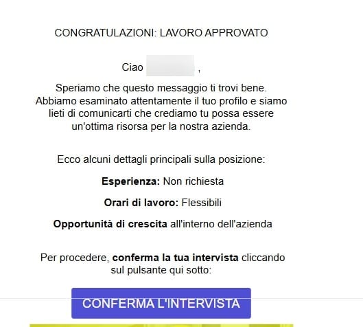 Acestea implică, de obicei, emailuri lungi, pline de text. Se afirmă că CV-ul a fost deja aprobat și sunt oferite instrucțiuni detaliate despre pașii următori. Destinatarii sunt îndrumați să descarce o aplicație de mesagerie, să contacteze un „manager HR” sau să folosească o platformă externă pentru programarea interviului.