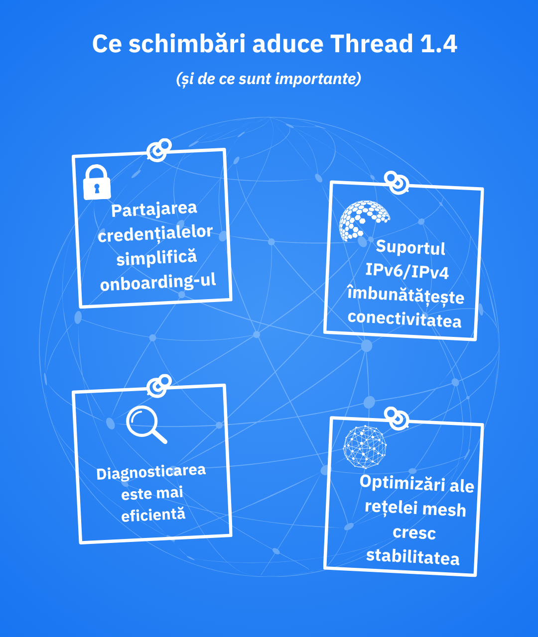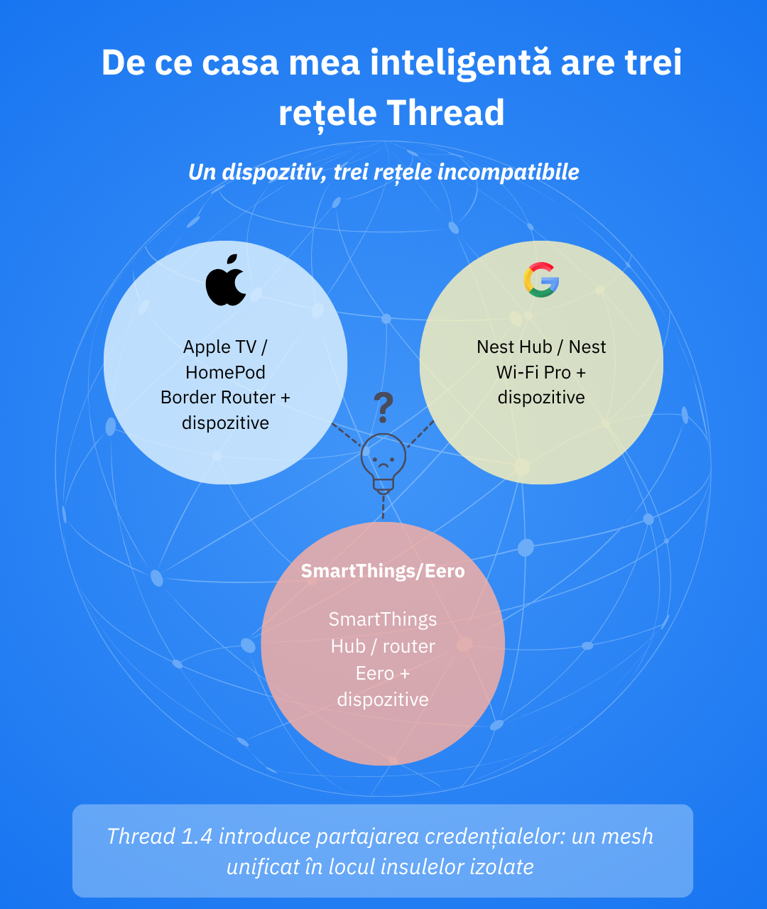 Thread 1.4 oferă instrumentele necesare pentru eliminarea haosului multi‑mesh: partajare de credențiale, diagnostice îmbunătățite, rutare mai robustă și infrastructură IP solidă. Totuși, actualizările pot întârzia să apară, așa că multe rețele rămân fragmentate.